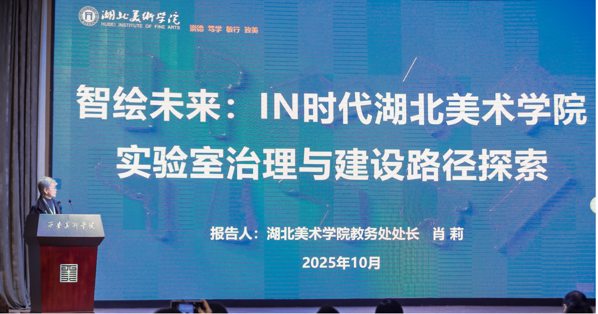 会议期间,肖莉作了题为“智绘未来:IN时代湖北美术学院实验室治理与建设路径探索”的主旨报告。报告系统介绍了我校实验室在“IN时代”背景下的发展现状、管理机制与建设路径,内容涵盖实验室概况、实验教学成果、队伍建设、安全管理与数字化建设等多个方面,提出通过构建“一体两翼”发展体系,推动实验室从传统教学空间向“艺术与科技融合”创新平台转型,逐步形成具有湖美特色的实验教学示范体系,为高质量艺术人才培养提供有力支撑。